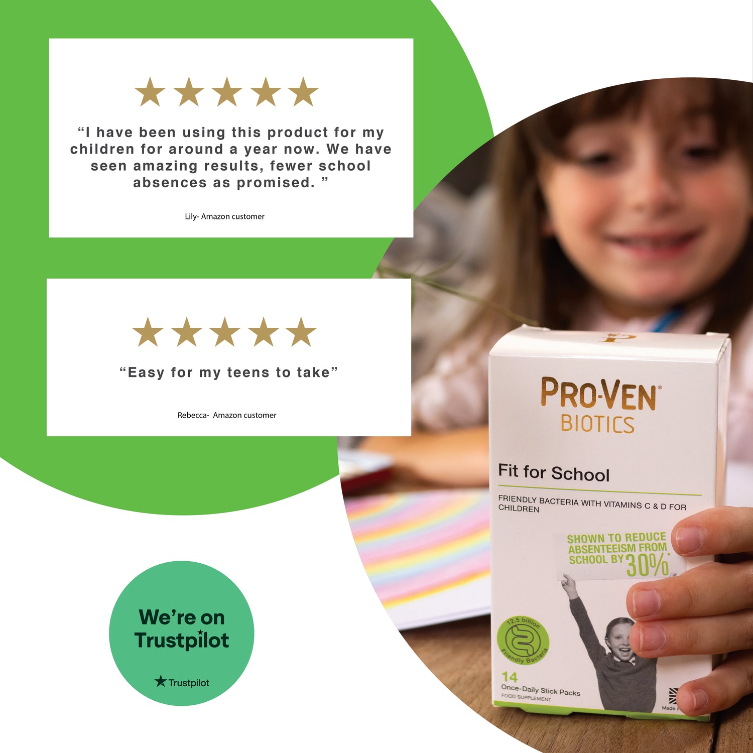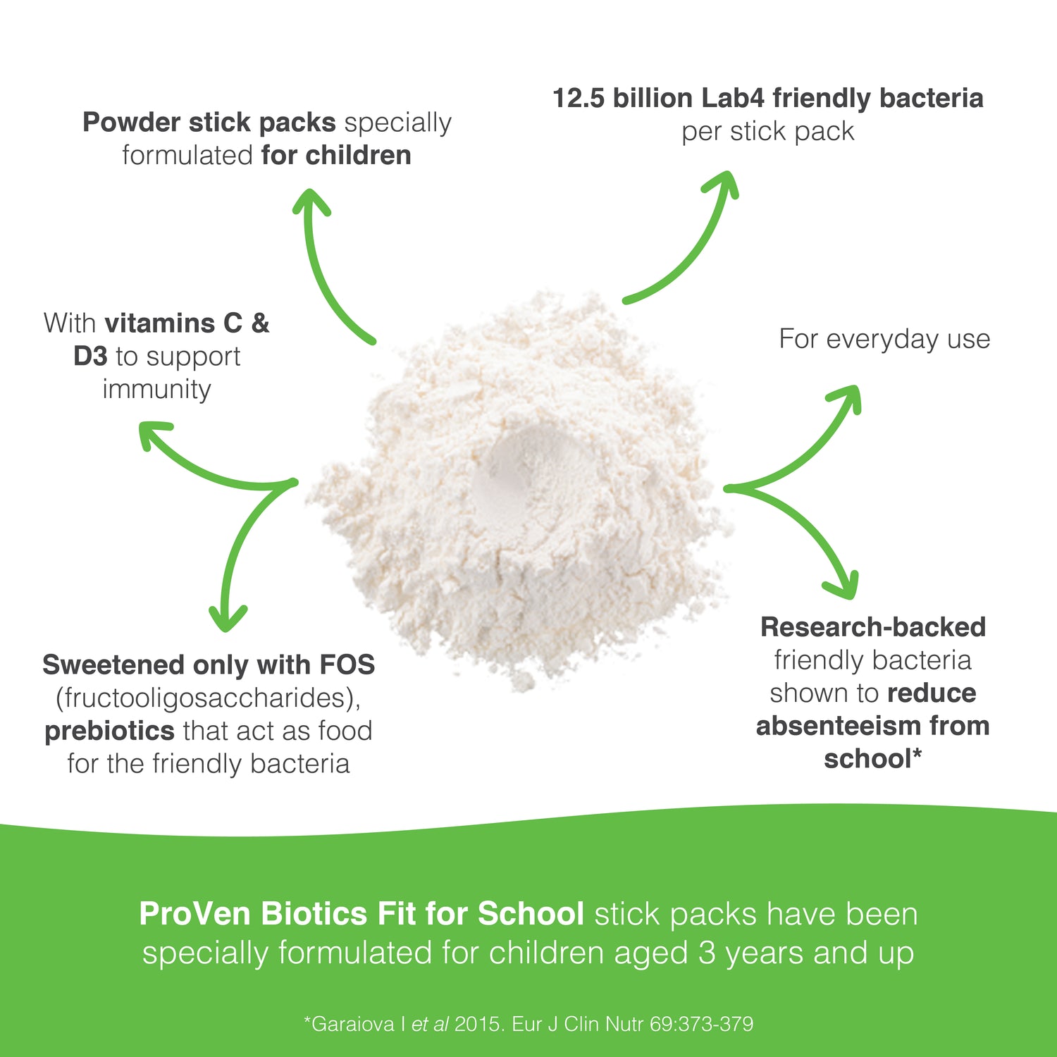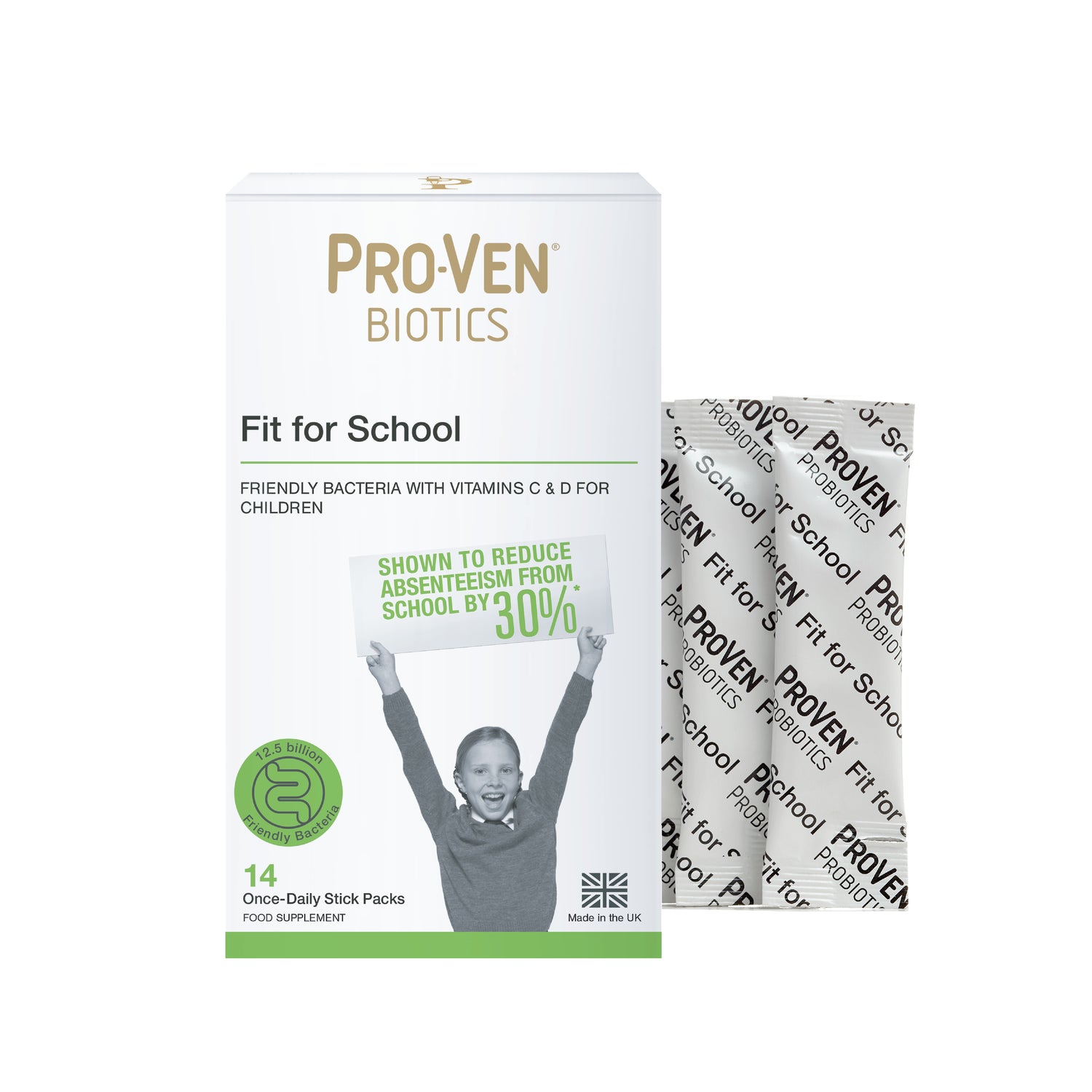 With research-backed Fit for School levels of friendly bacteria, the stick packs each contain 12.5 billion live bacteria with vitamin C and vitamin D, which both support immunity. They also contain FOS (fructooligosaccharides), prebiotic fibre which provides food for the friendly bacteria and is the only source of sweetness in this product. Just one stick pack every day can help to keep your child(ren) 'fit for school'.